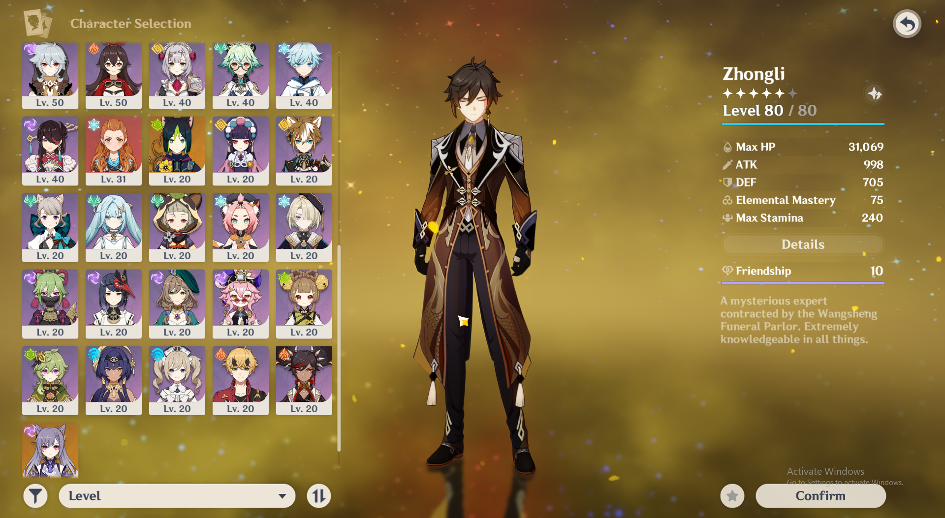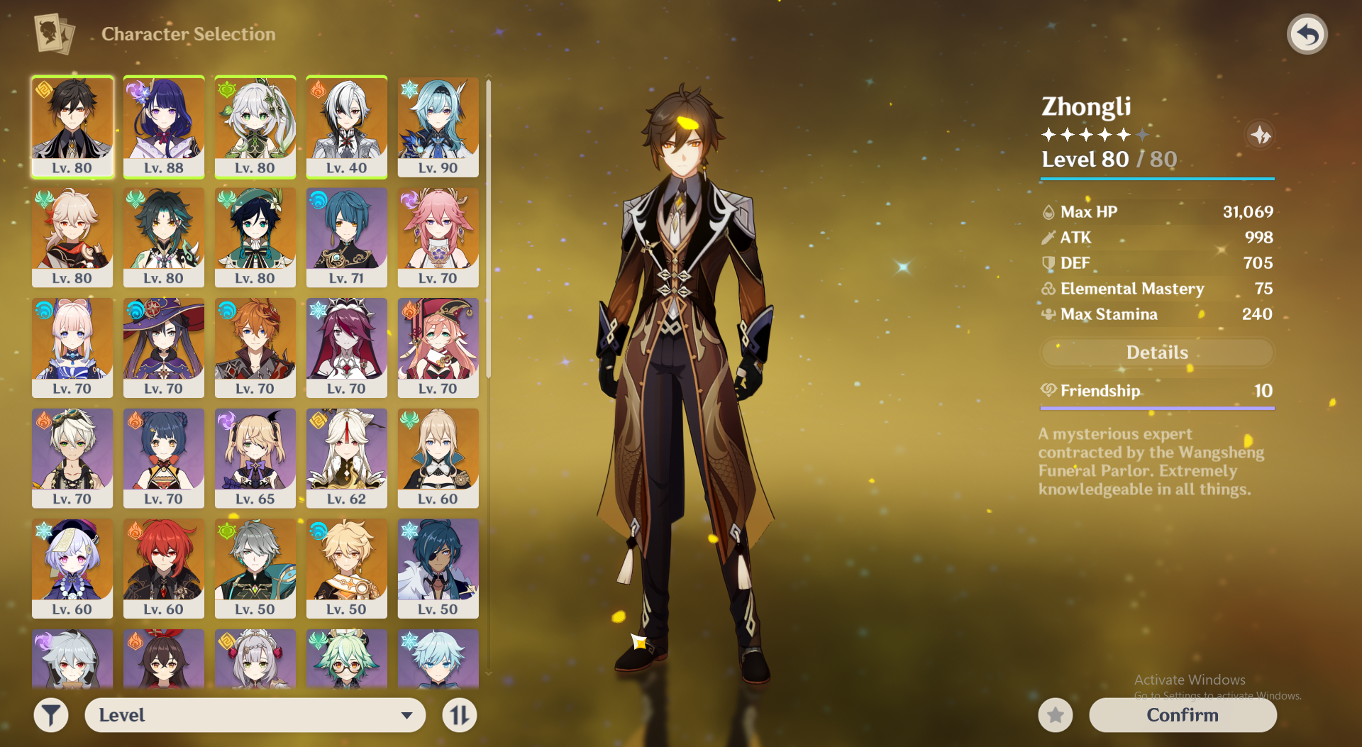 GI71: NA – AR 56 – 43 Legend – Eula C4 – Jean C4 – Diluc C2 – Shogun C2 – Mona C1 – Tartaglia C1 -Kokomi C1 – Qiqi C1